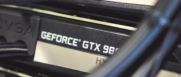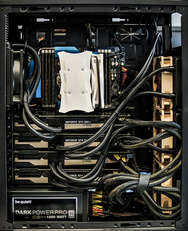 There were only 3 hybrid cooled cards available, from which only 2 had the required height to be stacked together. So we took the fastest which was the EVGA GTX980 TI HYBRID.